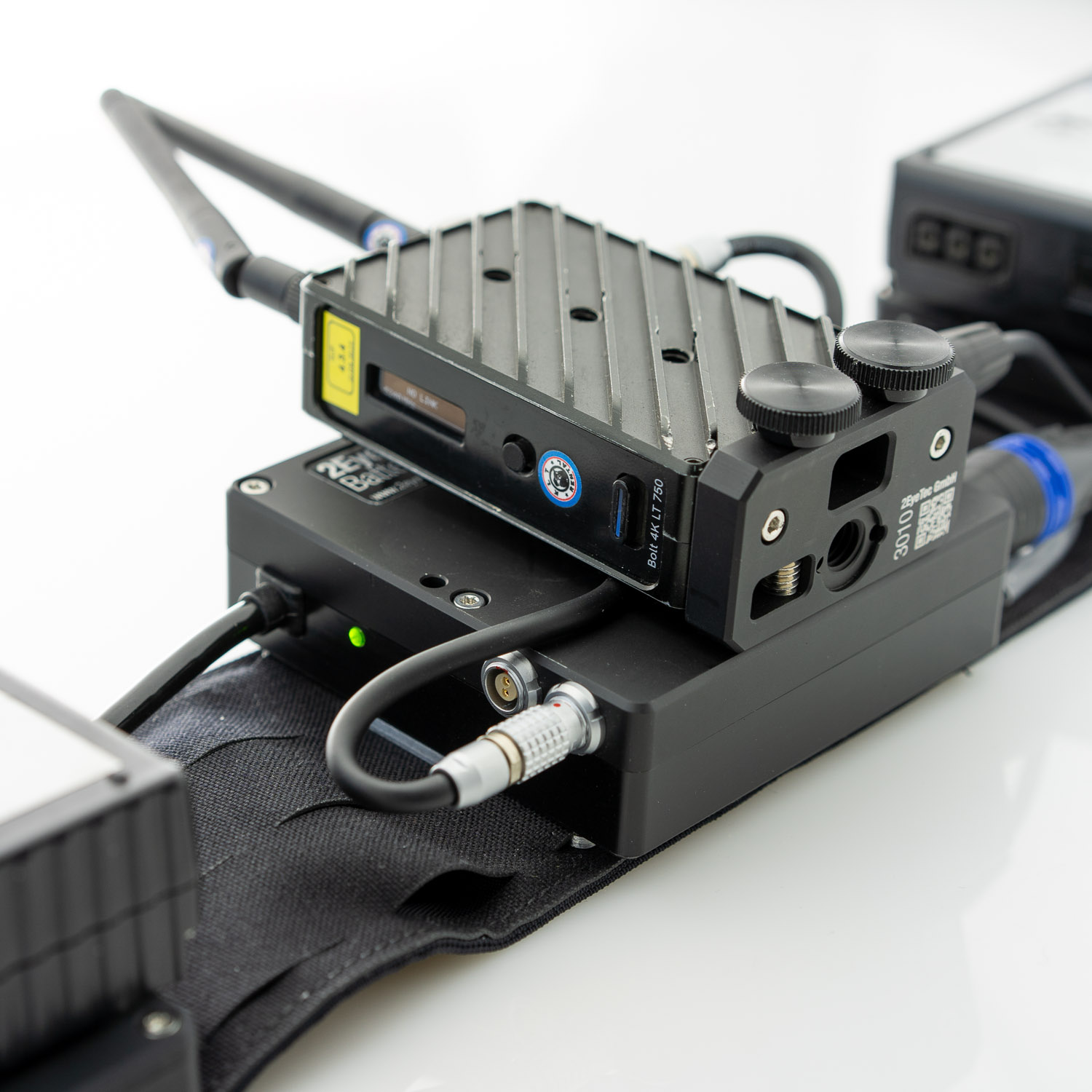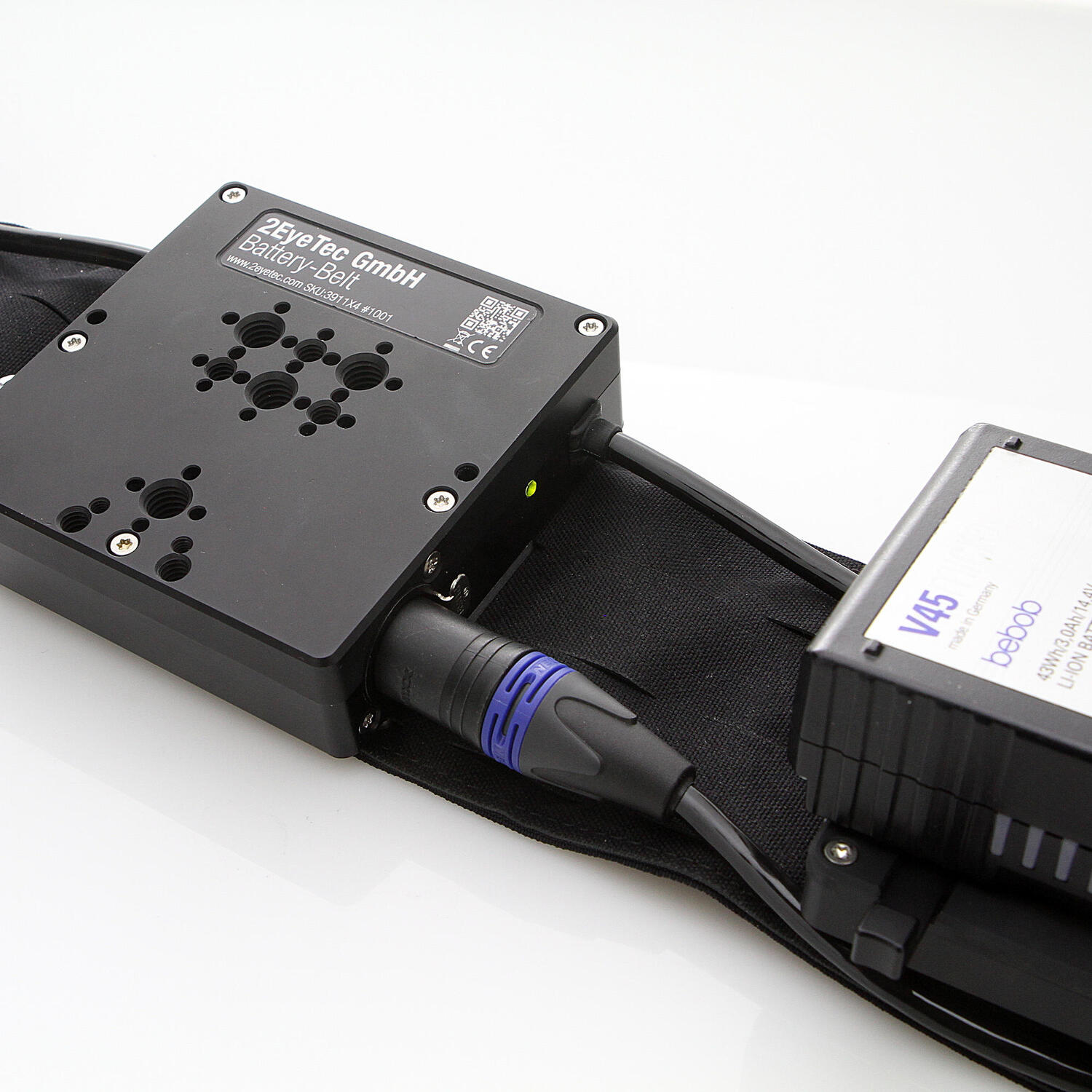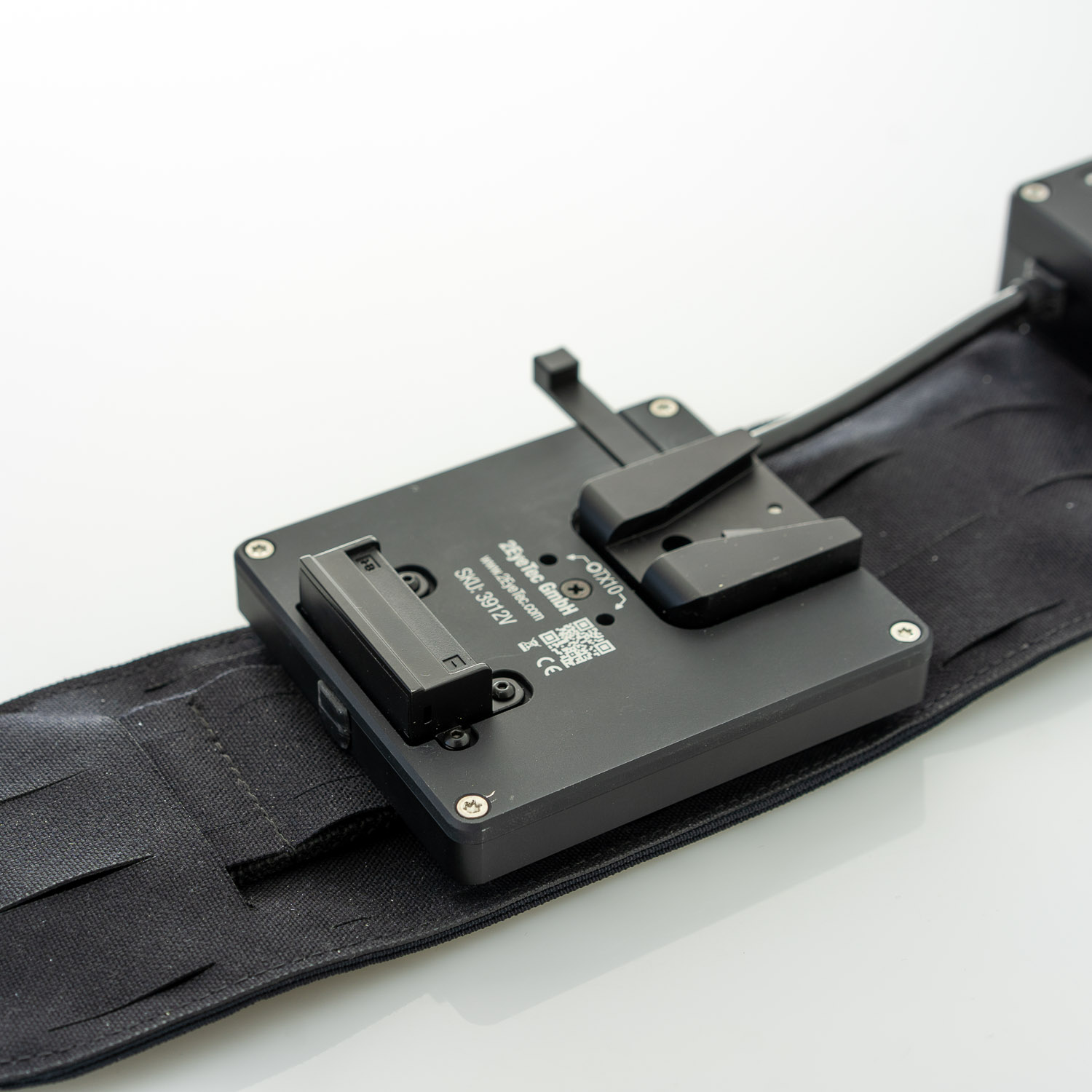 The battery belt essentially consists of three harmonised, modular components: the actual belt, two battery plates and a central hub. The system can be supplemented with a suitable camera cable and accessories for mounting video transmitters.