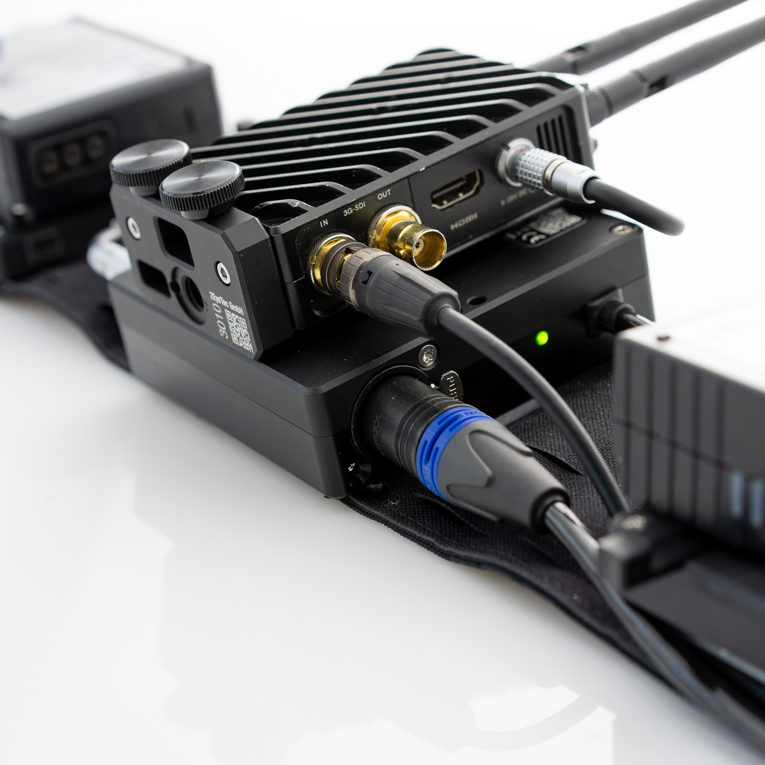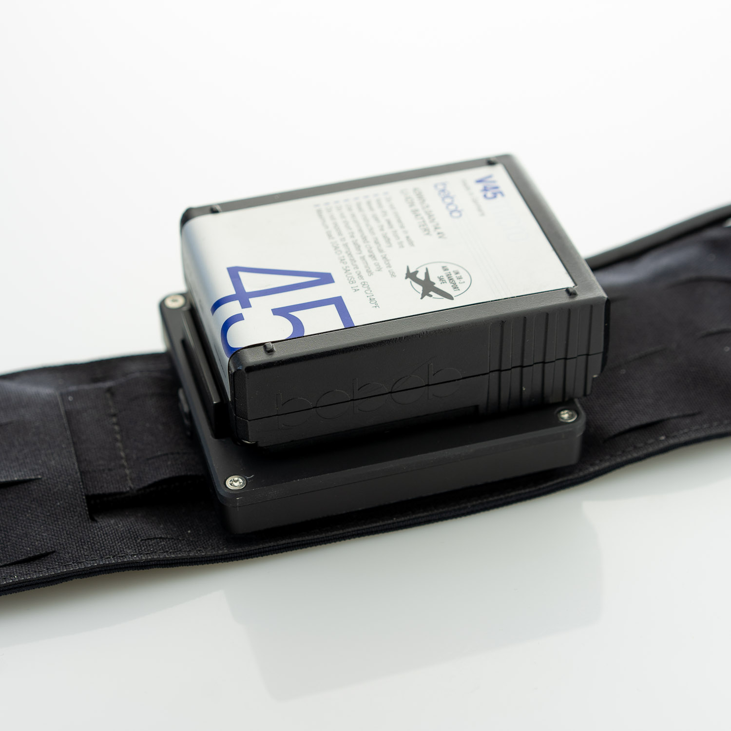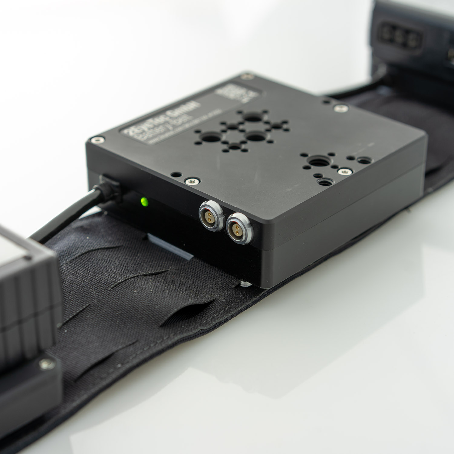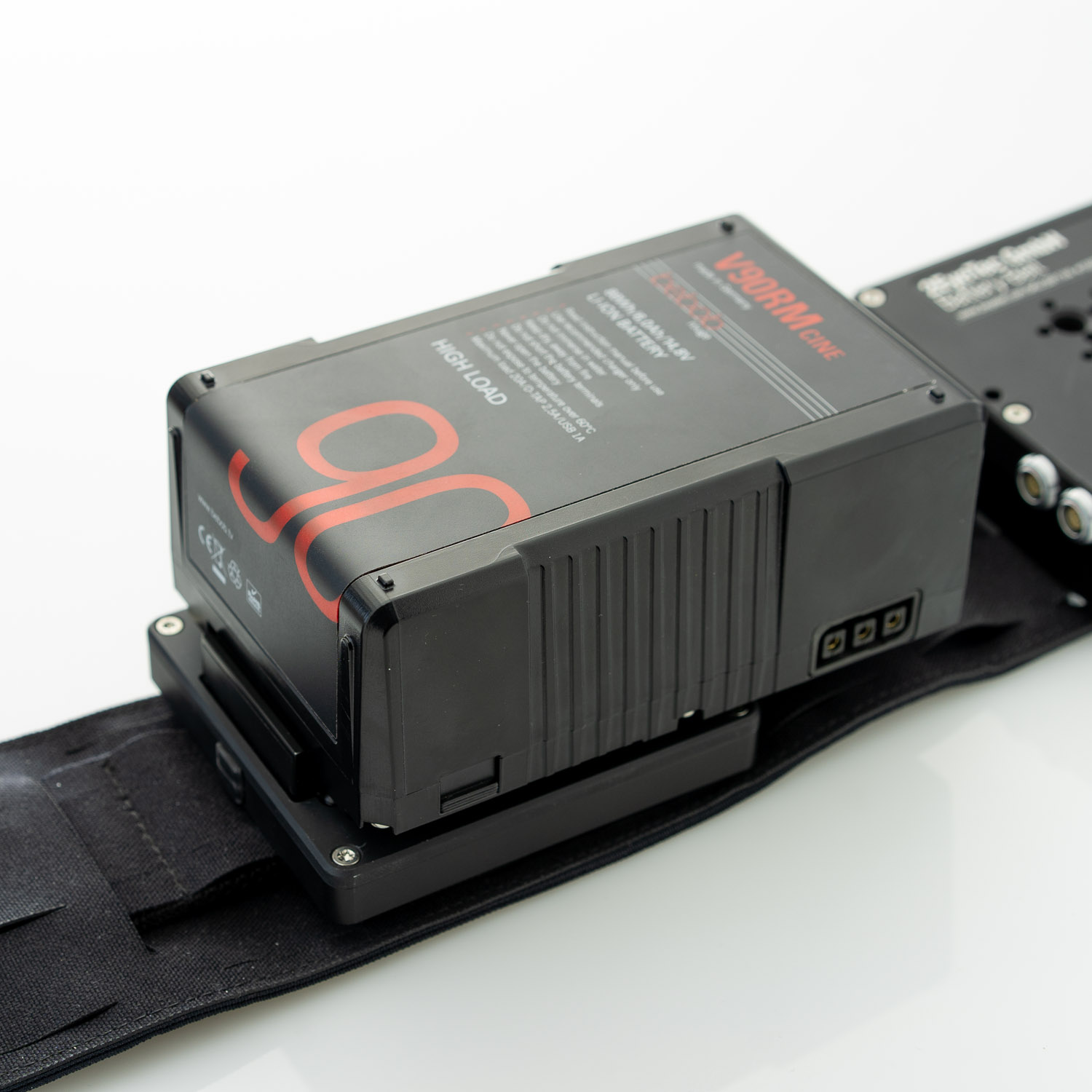 The battery belt essentially consists of three harmonised, modular components: the actual belt, two battery plates and a central hub. The system can be supplemented with a suitable camera cable and accessories for mounting video transmitters.