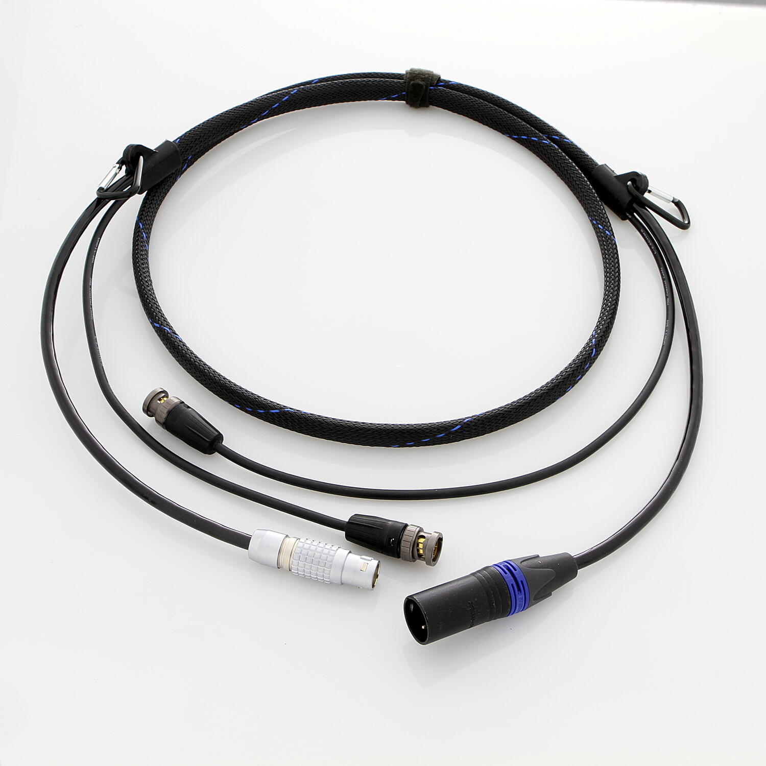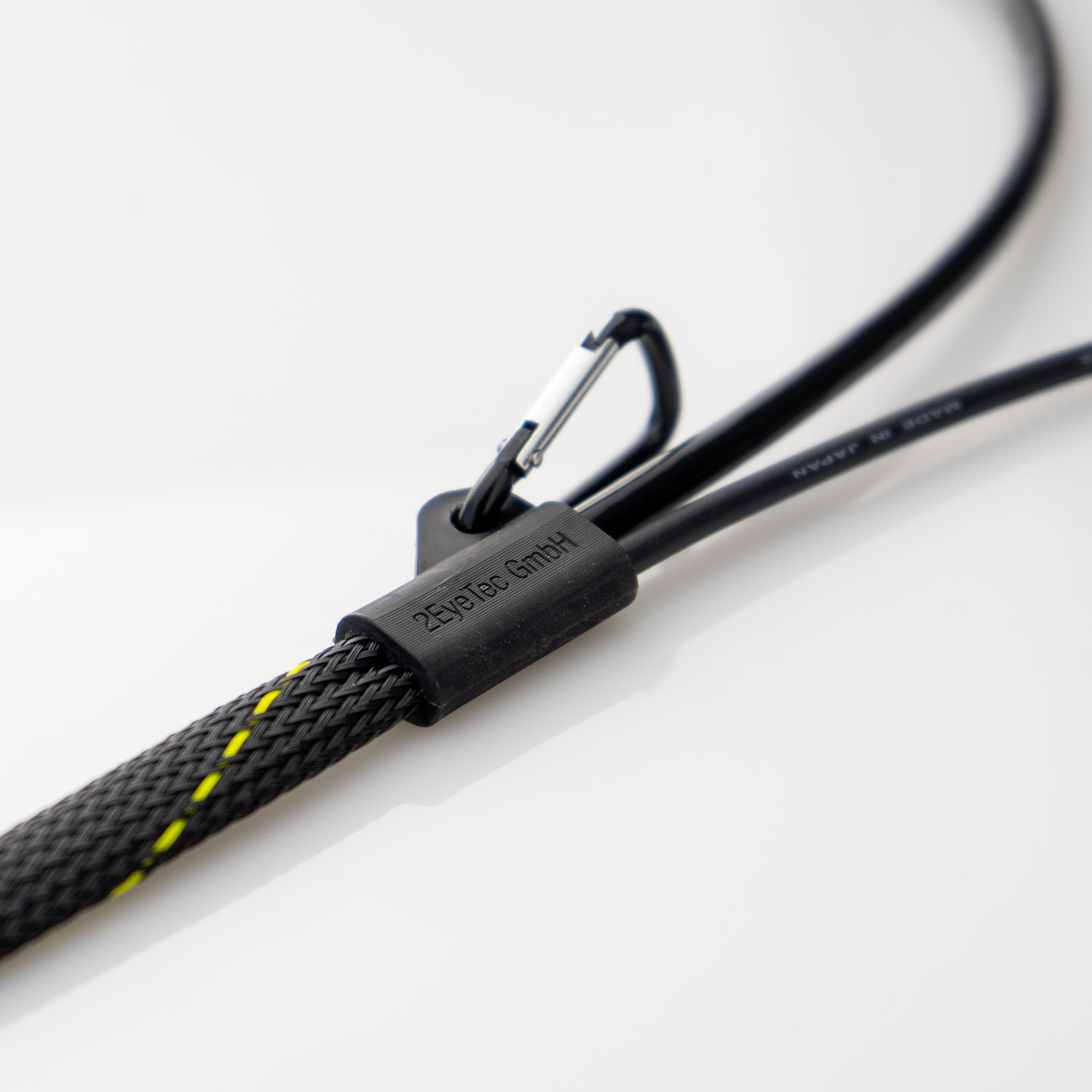 A combined power and video cable completes the setup. In this combination cable, a cable for the power supply and a flexible, 12G-capable BNC cable are combined in a braided tube. The ends of the braided sleeving are moulded to the cable to create a robust connection. It is virtually impossible for the braiding to slip out, as can happen when using heat-shrink tubing. An eyelet is also incorporated at both ends for strain relief.